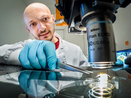 What the researchers at Campus Norrköping, together with colleagues in Lund and New Jersey, have now managed to create is a method where the polymerisation can take place only with the help of visible light. This is thanks to specially designed water-soluble monomers that the researchers have developed. This means that no toxic chemicals, harmful UV light or subsequent processes are needed to create the electrodes.